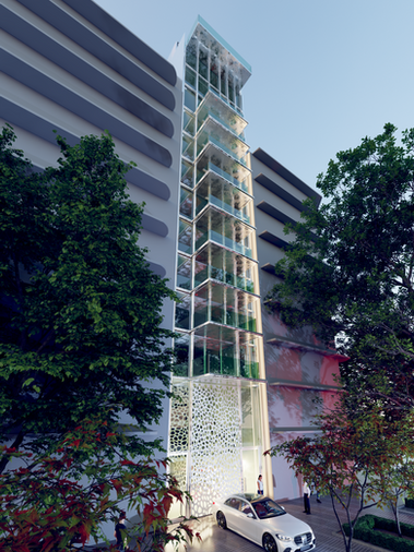Sobre la cota de siete metros de altura referida a la calle se elevan en doce pisos los más exclusivos seis dúplex en Avenida Libertador, la mejor y más segura zona de buenos aires, frente al lago y rosedal, con vista al río y la mejor orientación. La superficie propia de cada uno es aproximadamente 300m2. Por debajo de los siete metros de altura el edificio consta de dos entrepisos de cocheras agrupadas de a dos para abastecer de esa forma a cada departamento, amplias bauleras de 4m2 aproximadamente y portería auxiliar. En planta baja, el hall de acceso en doble altura divide con un muro de espuma de aluminio en forma innovadora el acceso principal del área de servicios y vehicular. Un subsuelo de cocheras y bauleras componen el total del edificio que no cuenta con amenities. La fachada está realizada en su totalidad en acero inoxidable y vidrio, siendo la espuma de aluminio con particular diseño y el acero inoxidable en la totalidad de la fachada no sólo las principales características identitarias del edificio en la ciudad sino también una garantía de calidad.